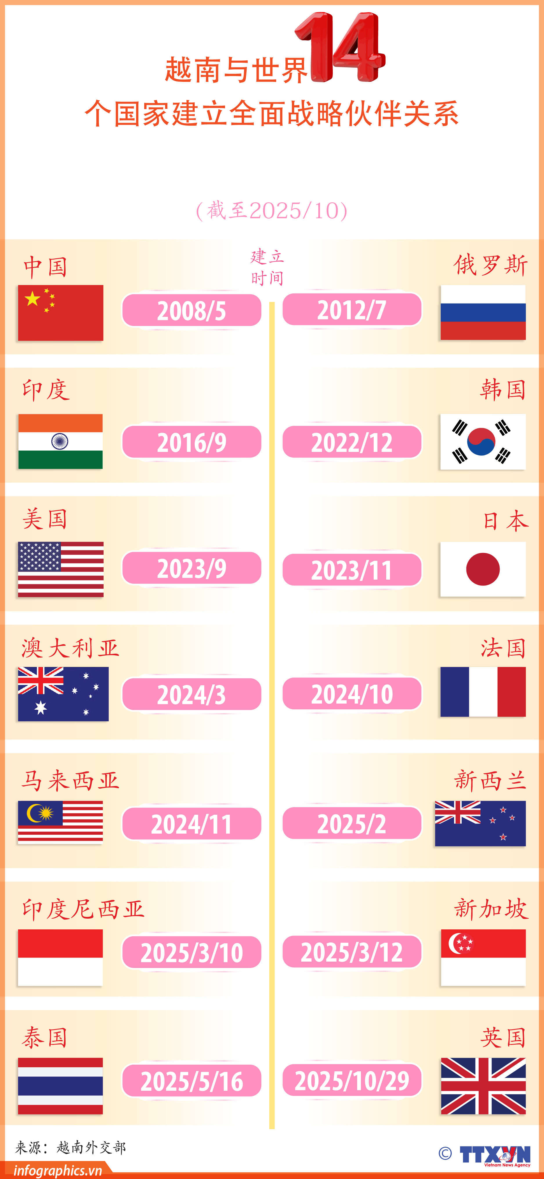 在越共中央总书记苏林对大不列颠及北爱尔兰联合王国进行正式访问期间,当地时间10月29日下午,英国首相基尔·斯塔默与苏林总书记举行会谈。会谈结束后,双方发表联合声明,宣布将越英关系提升为全面战略伙伴关系。至此,越南已同世界14个国家建立全面战略伙伴关系。