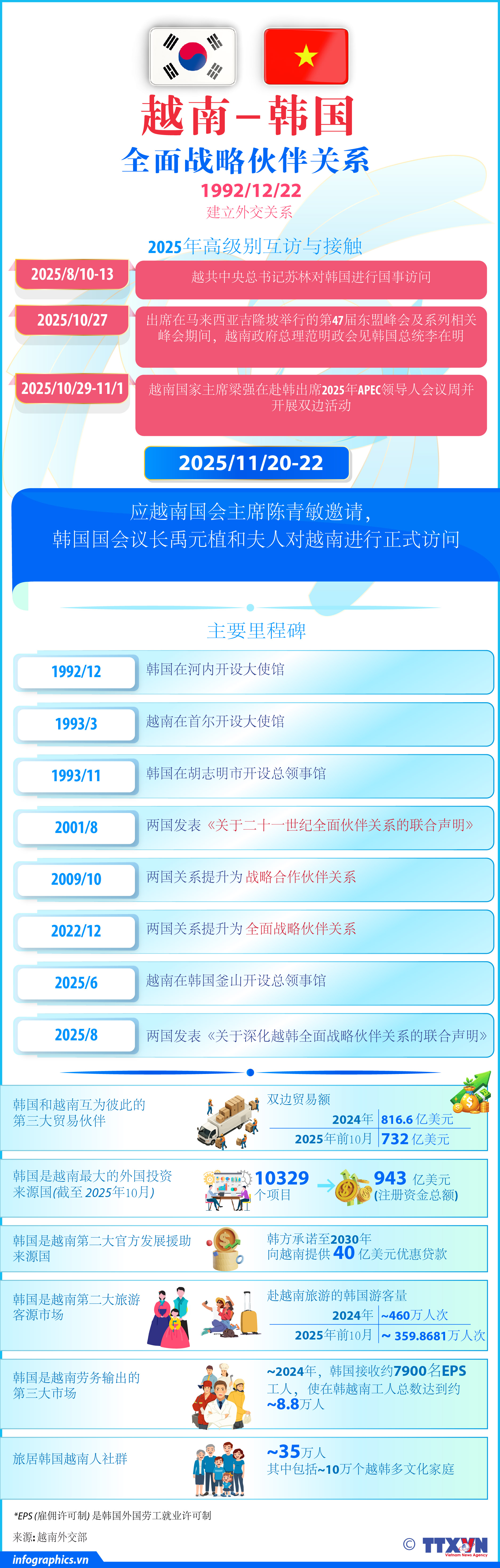 应越南国会主席陈青敏邀请,韩国国会议长禹元植和夫人将于2025年11月20日至22日对越南进行正式访问。