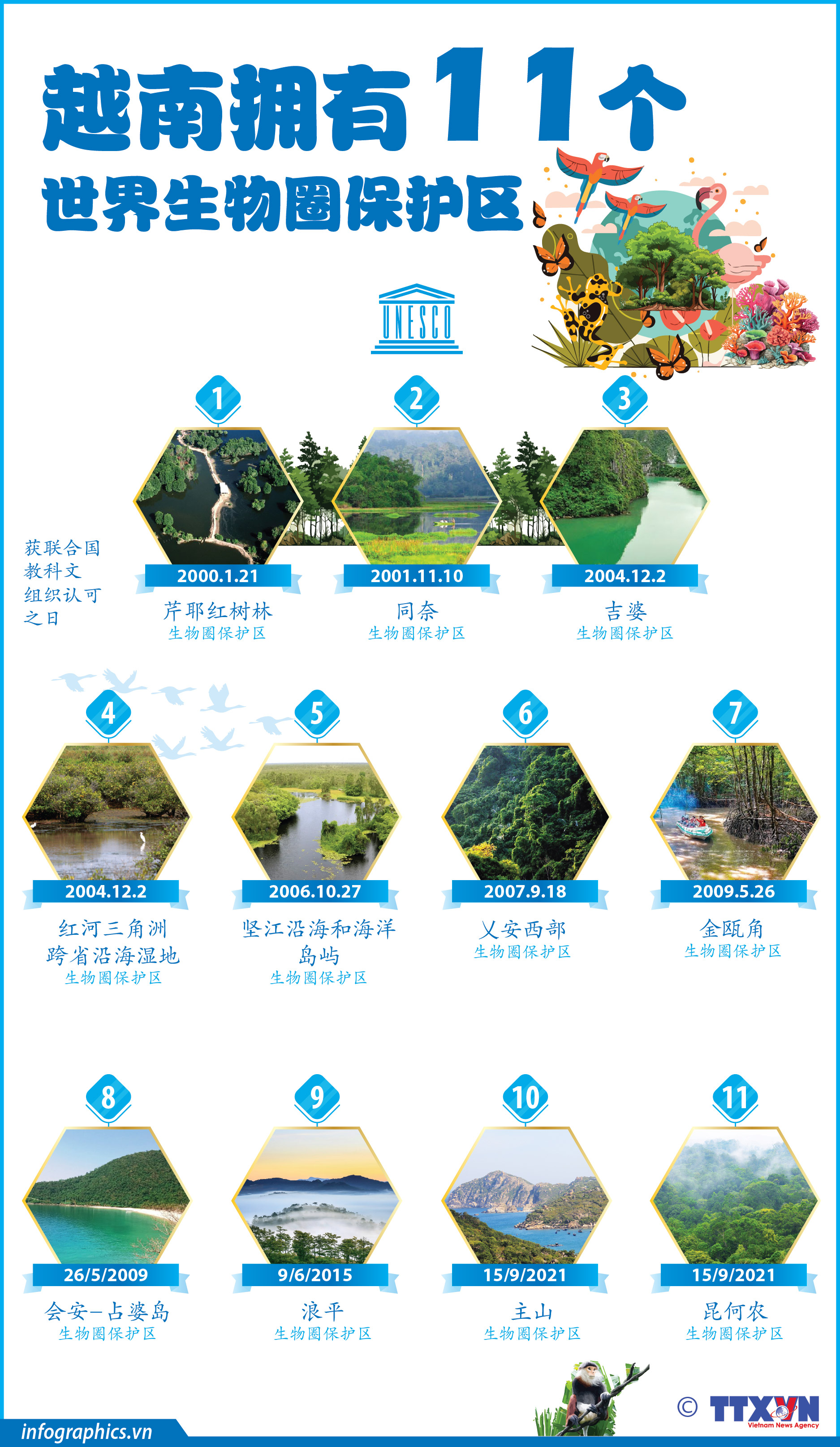 目前,越南拥有11个联合国教科文组织认可的世界生物圈保护区。这是联合国教科文组织授予具有特殊自然和生物多样性价值地区的称号。