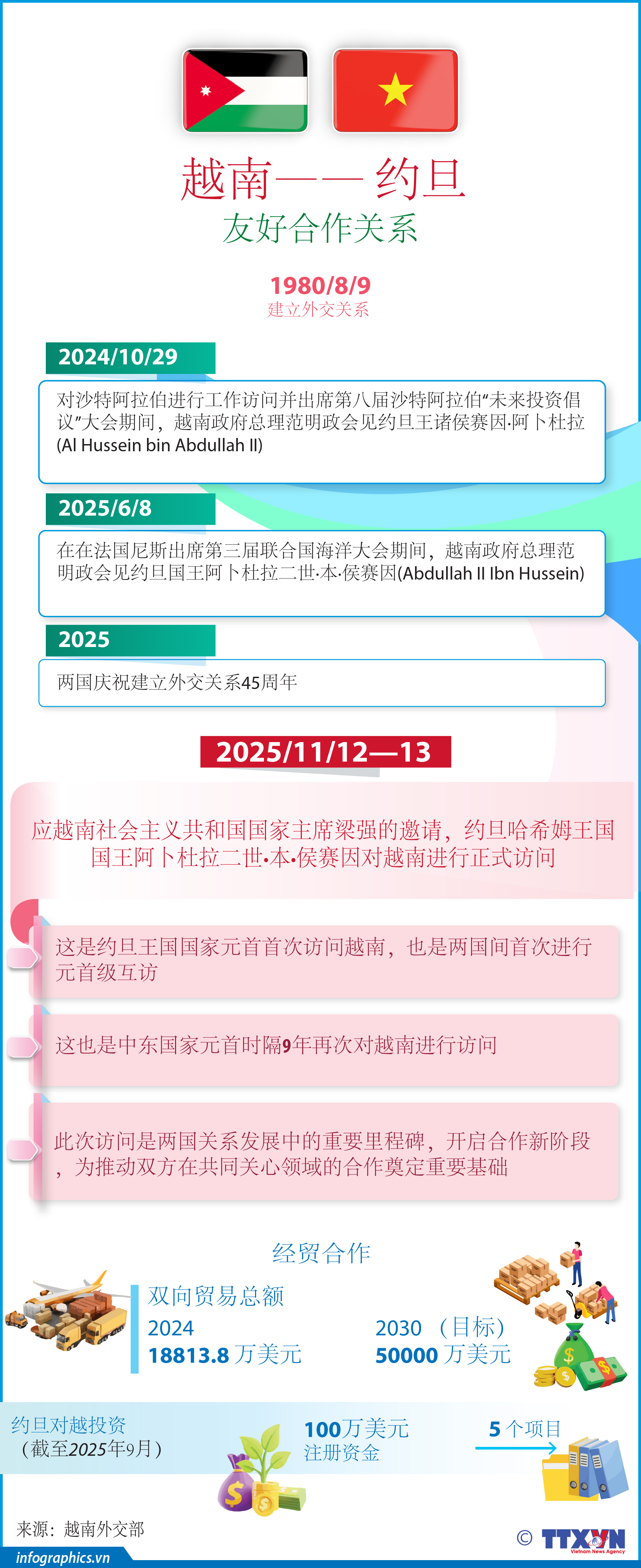 应越南社会主义共和国国家主席梁强的邀请,约旦哈希姆王国国王阿卜杜拉二世·本·侯赛因从2025年11月12日至13日对越南进行正式访问