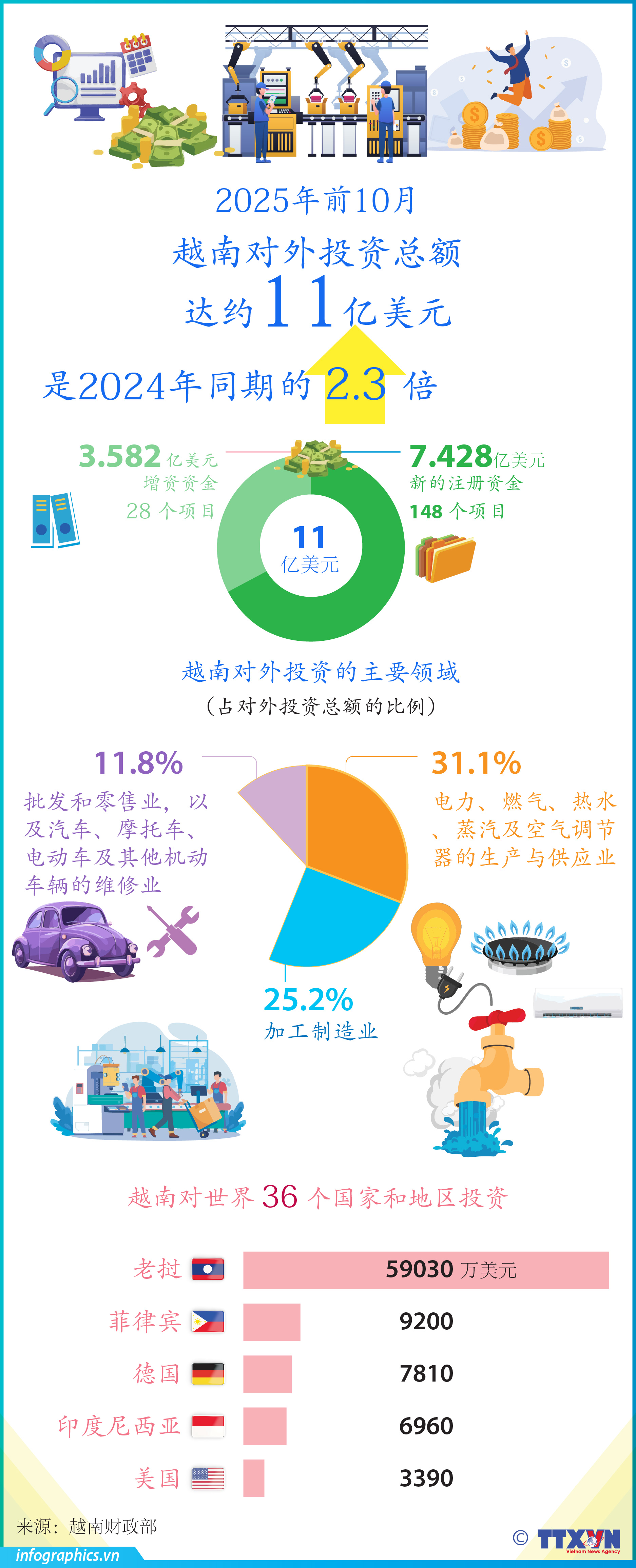 2025年前十个月,越南对外投资总额(包括新增资金和新的注册资金)达11亿美元,是2024年同期的2.3倍。