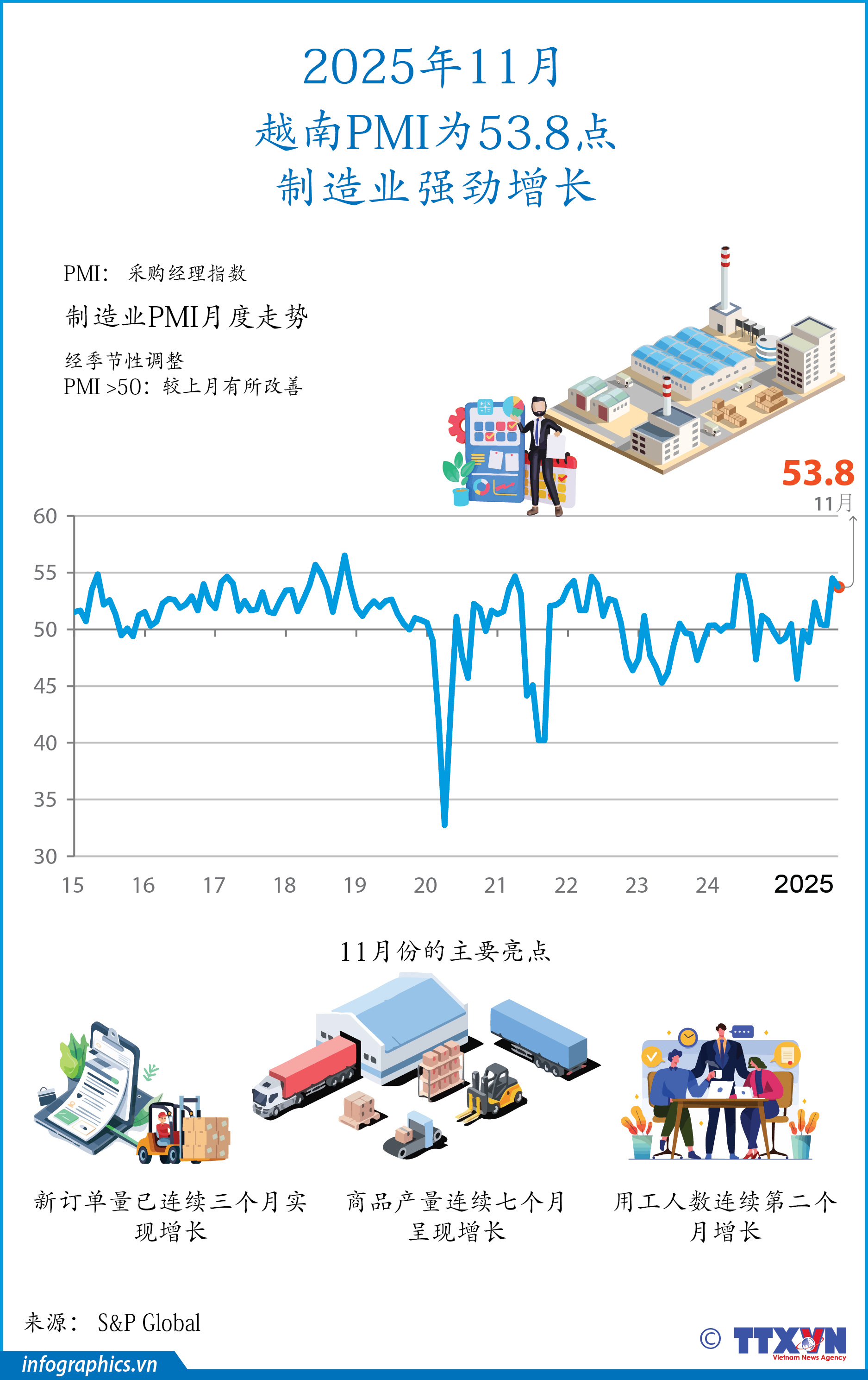 2025年11月,越南制造业采购经理指数(PMI)为53.8点,虽低于10月的54.5点,但仍稳居在50点荣枯线之上。