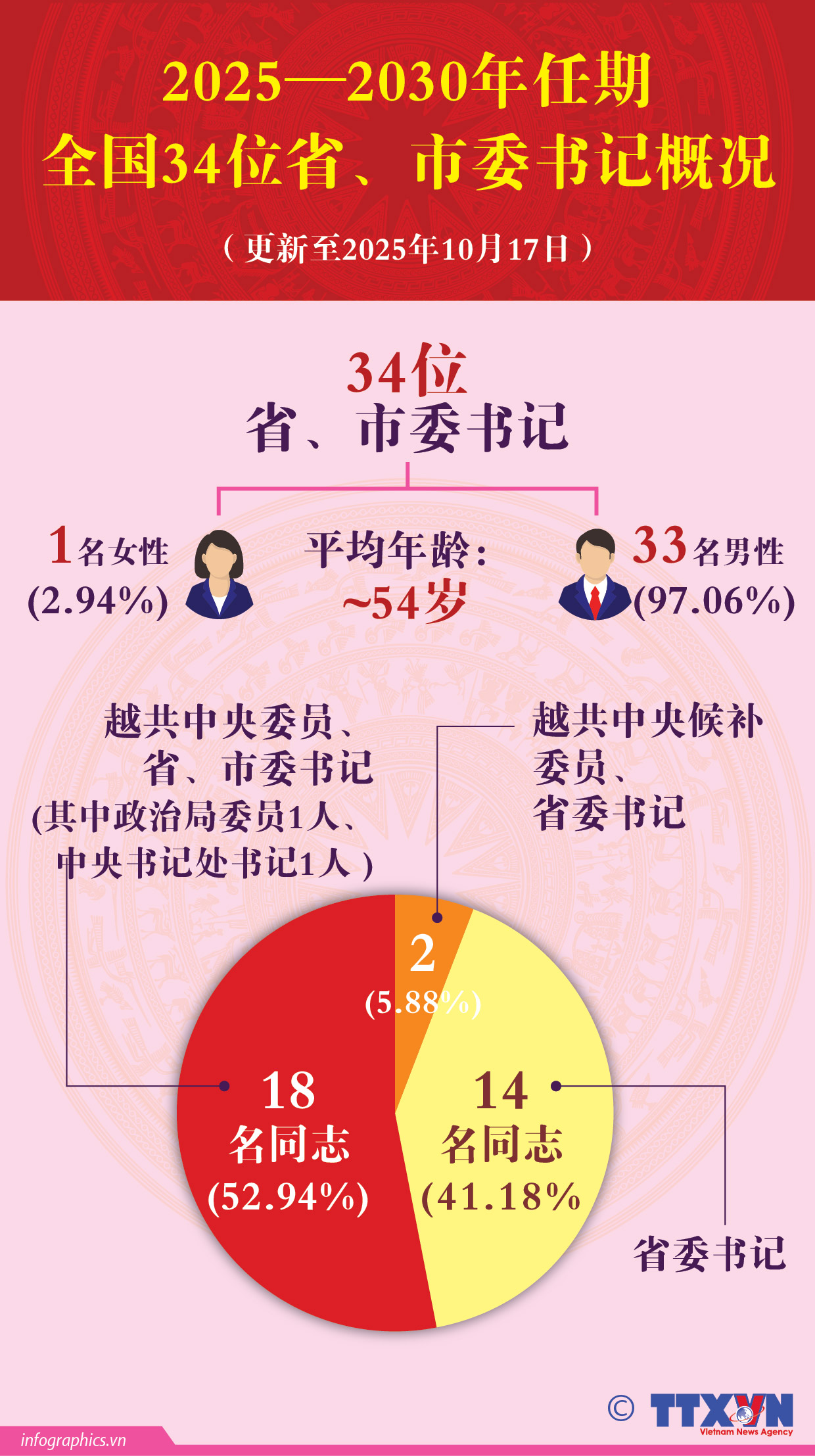 以下是关于2025—2030年任期全国34个省、市委书记的一些总体信息,包括平均年龄、男女比例、担任越共中央委员和候补委员的比例等。